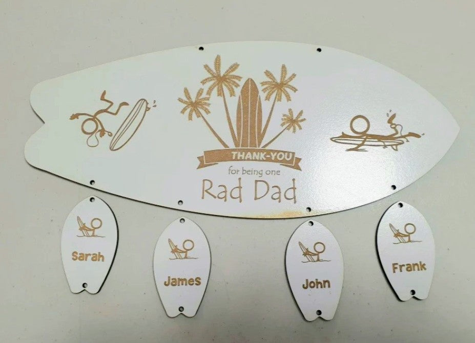 Bring a smile to Daddy’s  face with this adorable “Rad Dad surfy Personalised Plaque ” MDF Hanger – a fun and personalised gift from the kids!