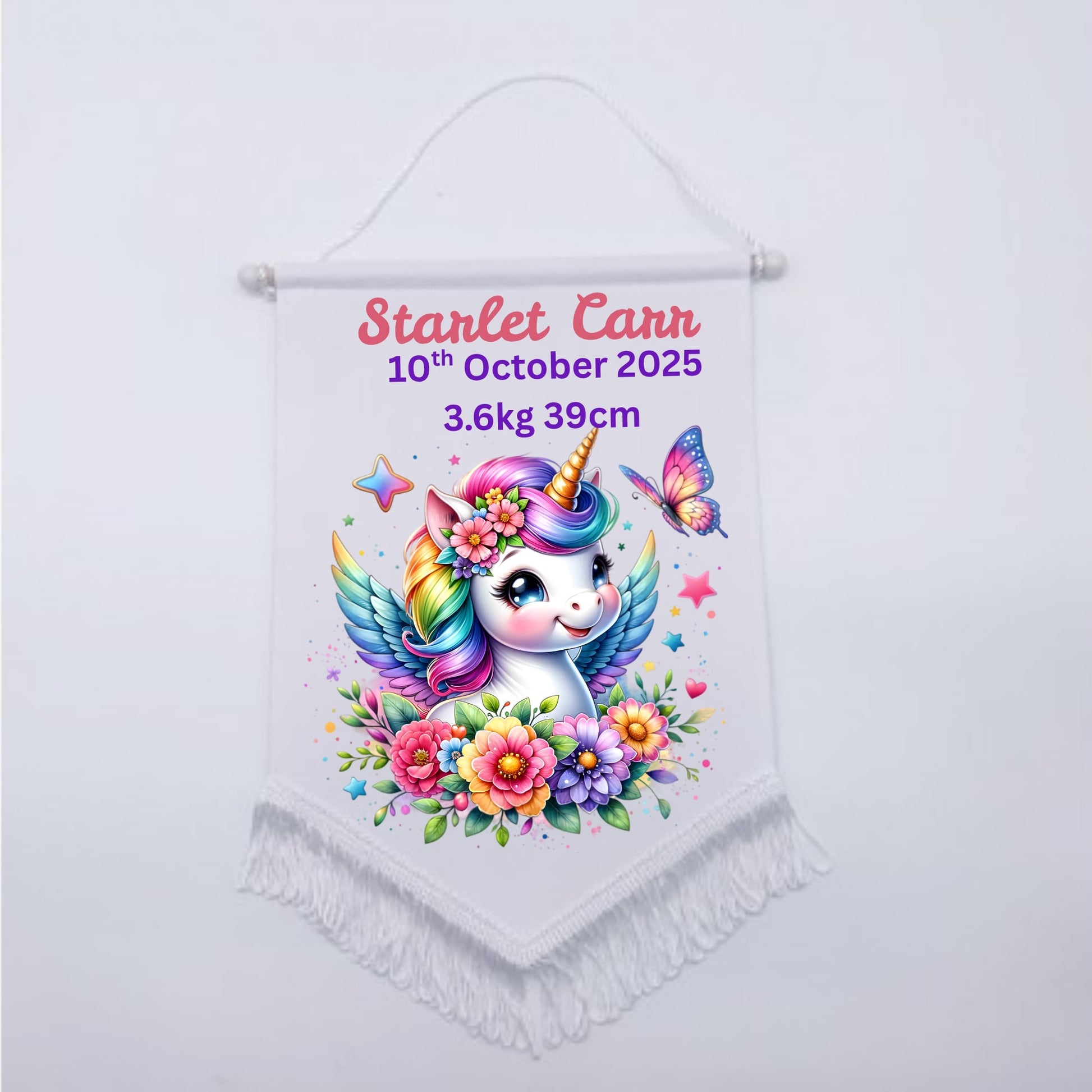 Personalised Baby Birth Stat Bunting Flag | Custom Name Nursery Decor | Newborn Wall Banner | Baby Shower Gift- Unicorn