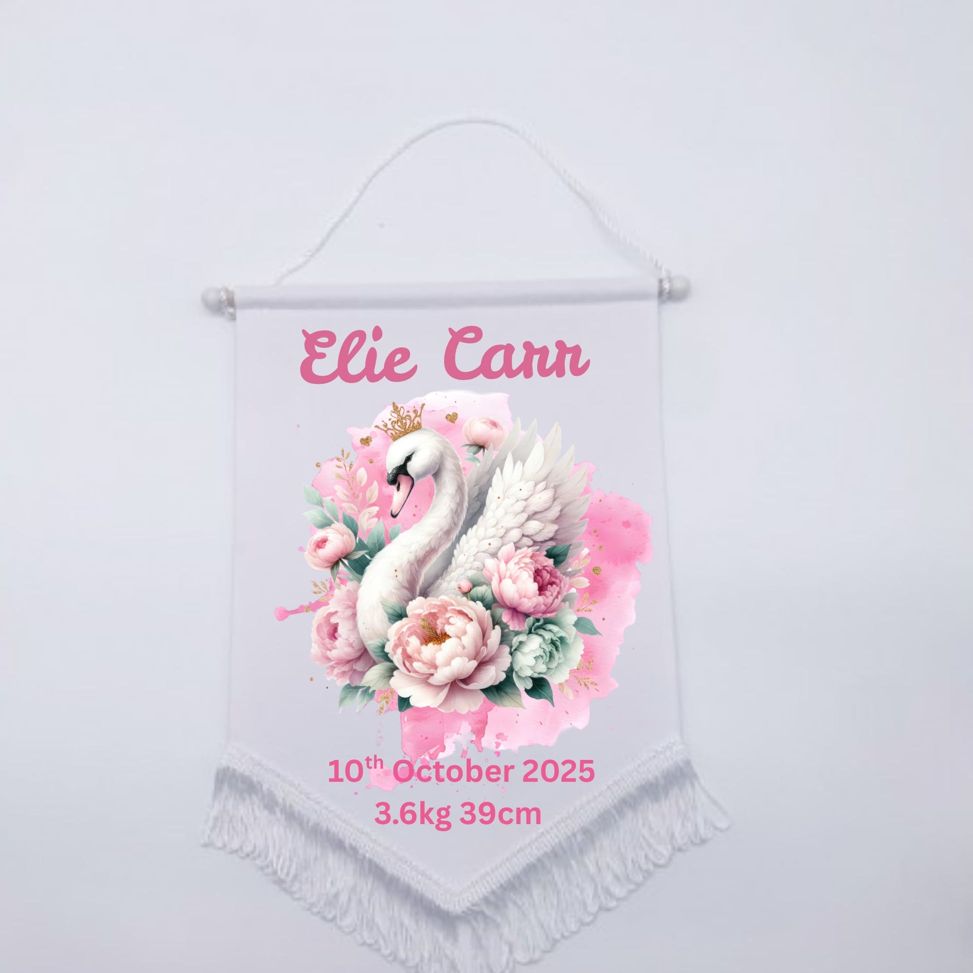 Personalised Baby Birth Stat Bunting Flag | Custom Name Nursery Decor | Newborn Wall Banner | Baby Shower Gift- Pretty Swan