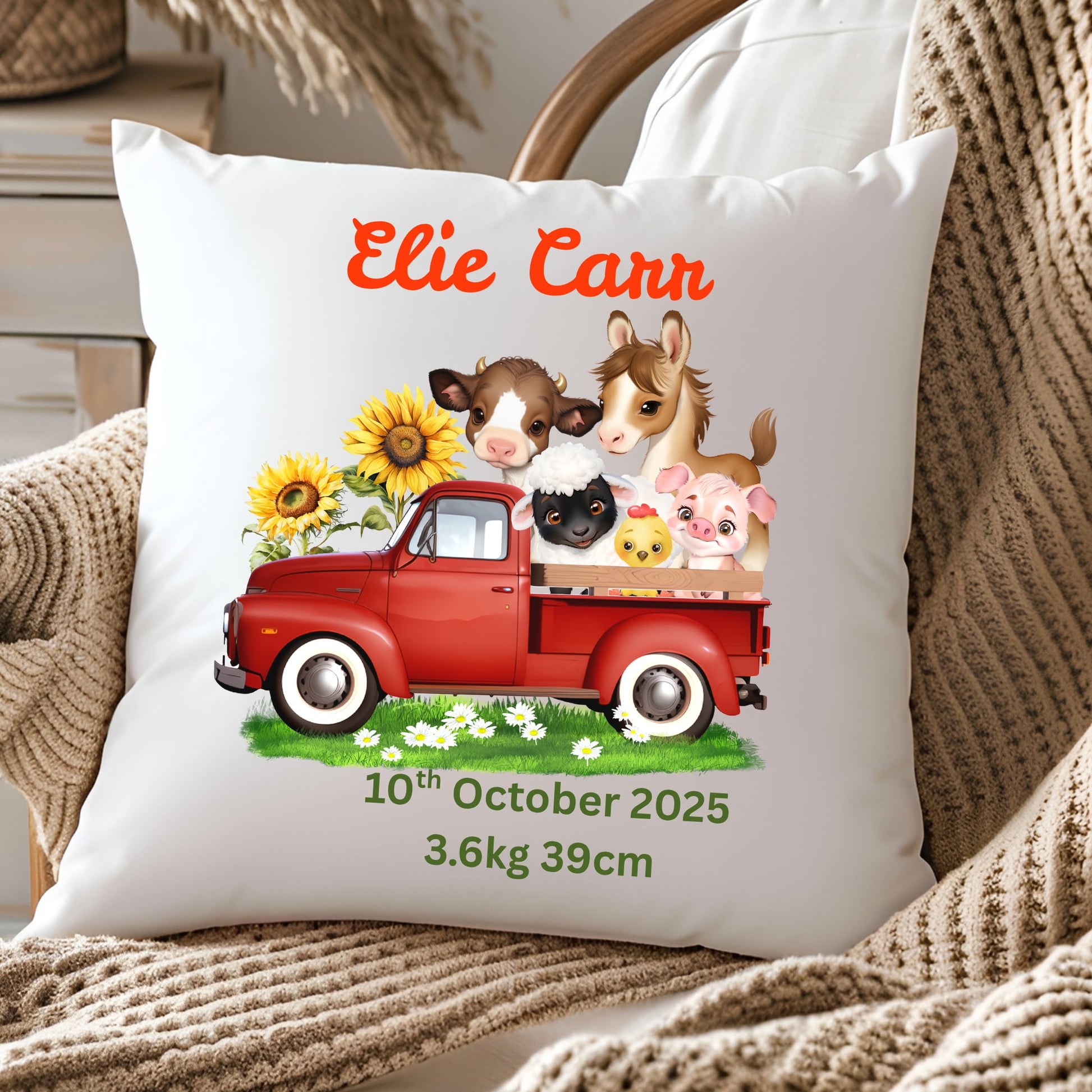 Personalised Baby Birth Stats Pillow Case with Insert | Newborn Keepsake Gift | Nursery Decor Baby Pillow- Farm Truck