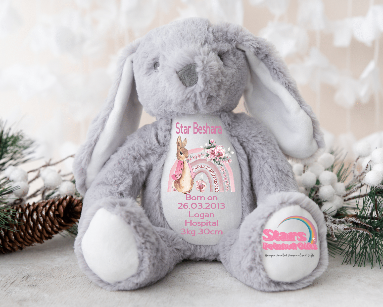 2.our larger bear sits 32 cm personalised with a printed belly, zip at back to hide keepsake, has a removable pod for easy washing.